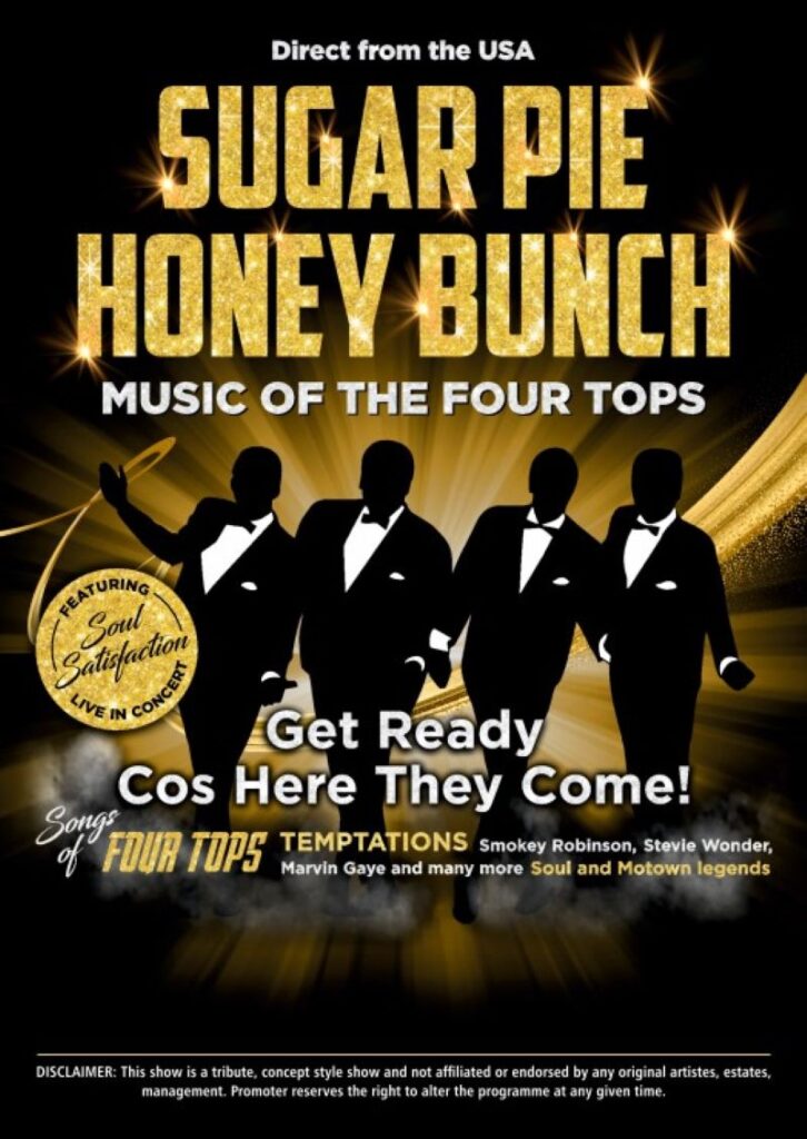 Visually exciting, musically authentic, all the Four Tops’ hits feature: Reach Out, Baby I Need Your Loving, I Can’t Help Myself (Sugar Pie), Standing In The Shadow, Bernadette, Walk Away Renee and Loco In Acapulco as well as the songs of The Temptations, Drifters, Miracles, Platters, Stylistics, Smokey Robinson, Ben E King and many more.